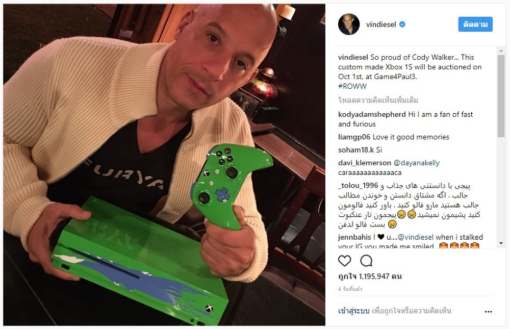 เครื่อง Xbox One S ที่พี่วินแกโพสต์ลง IG นั้นมันเป็นรุ่นพิเศษที่มีชื่อว่า "Xbox One S Custom" สีเขียวลายเดียวกับรถยนต์ Mitsubishi Eclipse ที่ Paul Walker ขับแสดงใน The Fast and the Furious โดยเครื่องนี้ไม่ได้เอามาอวดโชว์เล่นๆ แต่มีการประมูลขาย โดยรายได้จากการประมูลนั้นจะนำไปให้กับ Reach Out WorldWide ที่ตัว Paul ได้เป็นคนก่อตั้งขึ้นเมื่อปี 2010 โดยปัจจุบันน้องชายของเขา Cody Walker ได้ทำหน้าที่เป็นผู้จัดการและดูแลอยู่ ซึ่งในปี 2014 เขาก็ได้ไปช่วยเหลือผู้ประสบภัยแผ่นดินไหวด้วย โดยการประมูลเครื่อง Xbox One ตัวนี้จะเริ่มขึ้นในวันที่ 1 ตุลาคมนี้ ภายใต้ชื่อ "Game4Paul3" ครับ
