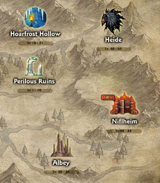 ดินแดน Niflheim นั้นถูกค้นพบในบริเวณไม่ไกลจาก Perilous Ruins และ Albey ไปทางทิศตะวันออกนักรบทั้งหลายสามารถจะเดินทางไปยัง Niflheim โดยจะต้องล่องเรือไปจากเมือง Colhen และ Rocheste เท่านั้น