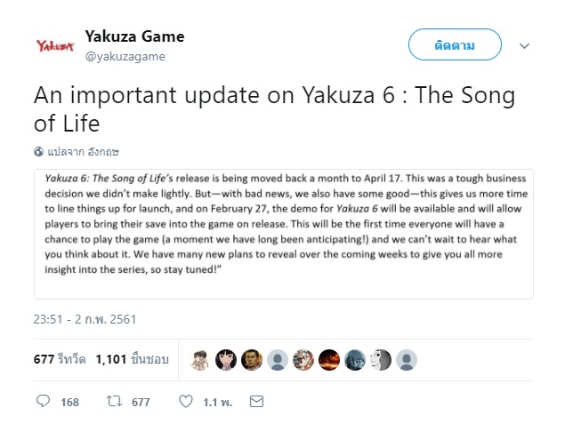 ติดโรคเลื่อนกันเข้าจนได้กับเกม Yakuza 6: The Song of Life เกมแนว Action สุดมันส์จากทีมผู้พัฒนา SEGA หลังจากที่ก่อนหน้านี้ได้ประกาศเตรียมวางจำหน่ายตัวเกมในวันที่ 20 มีนาคม ล่าสุดทาง SEGA ได้มีการโพสต์ข้อความลงทวิตเตอร์ว่าจำเป็นที่จะต้องเลื่อนการวางจำหน่ายตัวเกม Yakuza 6: The Song of Life ออกไปเป็นช่วงเดือนเมษายนแทน สาเหตุเพราะต้องการปรับปรุงตัวเกมให้เสร็จสมบูรณ์ก่อนที่จะวางจำหน่ายออกไป นอกจากนี้ยังมีการประกาศเพิ่มเติมว่าตัวเกมเวอร์ชั่น Demo จะปล่อยออกมาให้เกมเมอร์ได้ลองเล่นกันดูก่อนภายในเดือนกุมภาพันธ์นี้ค่ะ เนื้อเรื่องภายในเกมพูดถึง Kazuma Kiryu หนุ่มสุดเท่+โหดแห่ง Dojima และยังเป็นมาเฟียหนุ่มที่แข็งแกร่งที่สุดใน Kamurocho กลับมาในภาคนี้เขาจะต้องเจอกับเหตุการณ์มากมาย ความน่าสนใจของภาคนี้ก็คือเราสามารถเลือกคนที่จะมาเป็นทีมของแก็งเราเพื่อที่จะไปต่อสู้กับแก็งอื่นๆ สามารถ Set ได้ด้วยว่าต้องการให้ใครเป็นหัวหน้าทีม และ รองหัวหน้า แถมภาคนี้ยังระบบน่าสนใจเข้ามาให้เราได้เล่นกันเพียบเลยค่ะ มีมินิเกมสุดฮารอผู้เล่นกันอยู่ สำหรับเกม Yakuza 6: The Song of Life มีกำหนดวางจำหน่ายบนเครื่อง PlayStation 4 แหล่งอ้างอิงข้อมูลข่าว: คลิ๊กที่นี่
