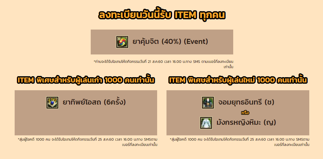 ทุกคนที่ลงทะเบียนถูกต้อง รับไอเทมไปเลยฟรีๆ นอกจากนั้นสำหรับ1,000คนแรก ที่ลงทะเบียนเร็วที่สุด(ของแต่ละประเภท) รับเพิ่มไอเทมพิเศษ!! ช้าหมด อดนะจ้ะ รายละเอียดไอเทมดังนี้