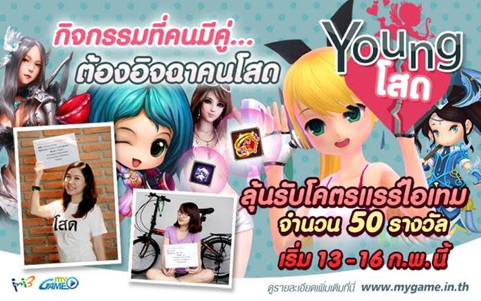 ฝันร้ายของคนไร้คู่ในเทศกาลวาเลนไทน์จะหมดไป ความอายของคนไม่มีแฟนกำลังถูกทำลายทิ้ง เมื่อคำว่า "แฟน" หรือ "คนรัก" กลายเป็นสิ่งต้องห้าม เตรียมเปิดพื้นที่พิเศษให้คนไม่มีคู่ได้มีที่ยืน กล้าลุกขึ้นมายืดอก ยอมรับสถานะ "โสด" กันอย่างเต็มภาคภูมิ เวทีกิจกรรมที่คนมีคู่ต้องเป็นฝ่ายอิจฉาคน "ยังโสด" บ้าง!! เพียงเพื่อนๆ จากเกม Pangya, BOOMz, C9, Touch Online และ มังกรหยก Frontier ที่ตัวละครมีสถานะ "โสด" ออกมาแสดงจุดยืน ถ่ายภาพตัวเองพร้อมบรรยายความโสดแบบสุขฝุดๆ จนคนมีแฟนทั้งหลายต้องตาร้อนเฝ่โพสต์เข้ามาร่วมกิจกรรม YOUNGโสด จะมีสิทธิ์ลุ้นรับแรร์ไอเทมเกมนั้นๆ ไปเลย ทันที!! งานนี้คนโสดได้ยิ้มกว้าง คนมีเจ้าของตาร้อนผ่าว!! 13 - 16 กุมภาพันธ์ เท่านั้นนะจ๊ะ...คน YOUNGโสด  ทั้งหลายยยย มาโสดให้สุขๆ กันเถอะ!!~~